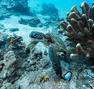 Hawaii’s graceful green sea turtles captivate snorkelers and SNUBA® divers as they glide through the crystal-clear waters of their natural habitat.